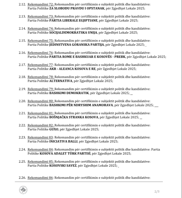 Sipas rendit të ditës të dërguar nga KQZ, për mbledhjen e datës 21 gusht, ora 17:00, këto janë subjektet politike të cilat janë rekomanduar për certifikim nga Zyra për Regjistrim, Certifikim dhe Kontrollin Financiar të Subjekteve Politike: